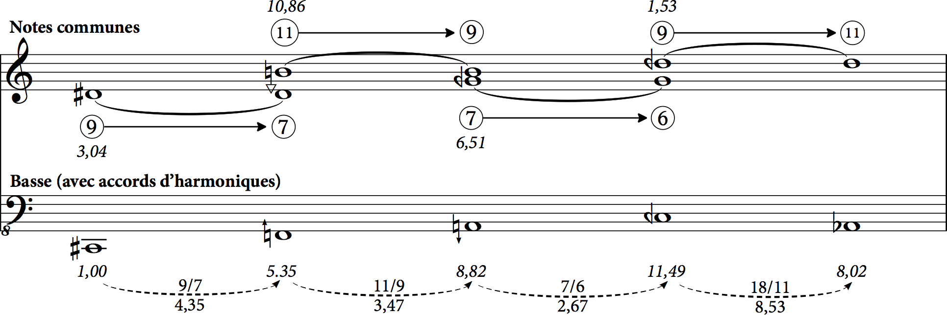 La musique de Haas a intégré les leçons d’œuvres à forme ouverte comme in iij. Noct. sur le plan de la prise de parole, c’est-à-dire que la narratrice n’est plus tenue à une stricte synchronicité, mais que l’ensemble instrumental peut avancer ou répéter des segments pour se synchroniser avec le flux du texte parlé. Ce qui donne une partition essentiellement linéaire, mais avec quelques passages en ossia permettant une certaine flexibilité. Le mouvement harmonique est résumé dans la figure 6, qui montre comment les tons communs des voix supérieures régulent les intervalles d’intonation juste d’une note de la basse à l’autre, chacune ayant son propre accord de série harmonique16. Même si les intervalles entre les notes de basse font appel à des rapports complexes et à des intervalles microtonaux inhabituels, la progression est fermée : elle se termine près de son point de départ, à une quinte juste de distance. Le la bémol final (à 7,02 demi-tons du do dièse initial) est en fait de retour au tempérament égal, et devient la note de base d’un cluster chromatique du registre grave dans la section suivante.